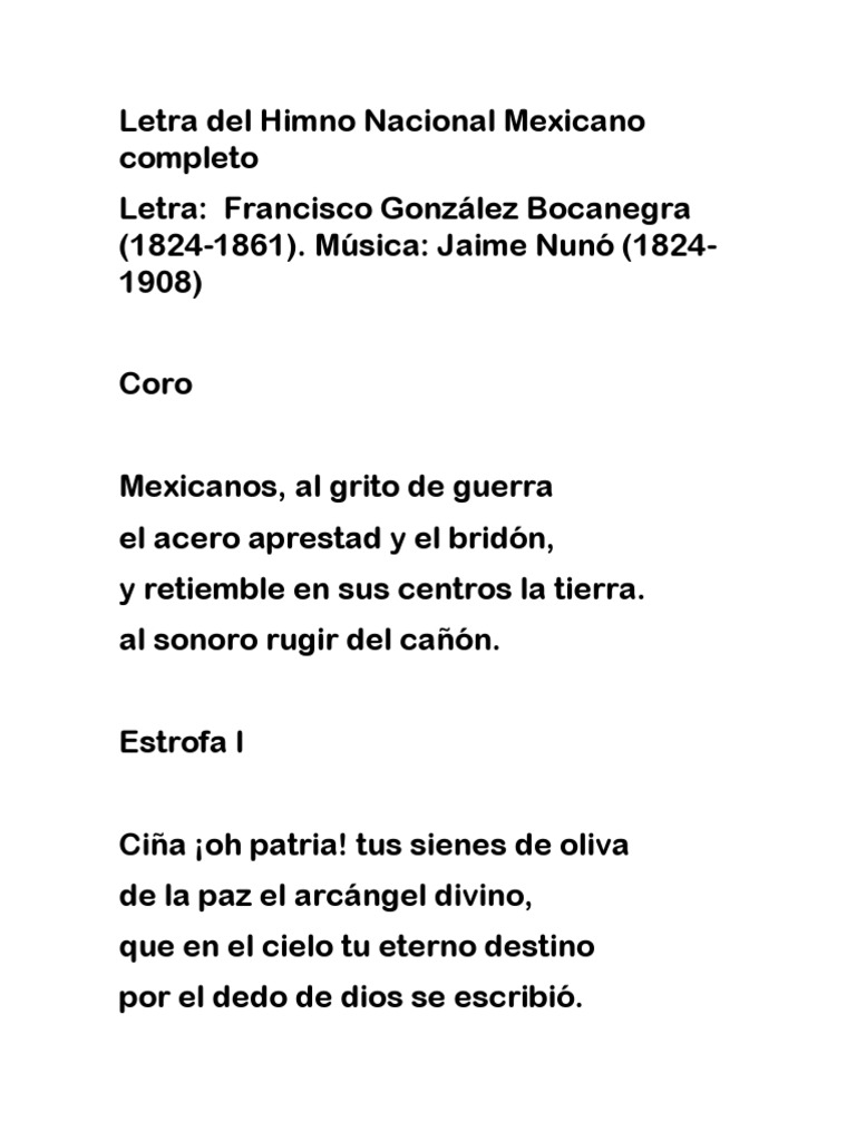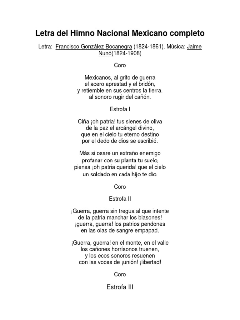 Esta compuesta por 45 versos, pero solo pondremos el ejemplo del coro, la i y la iv. Las fuertes pugnas ideológicas que caracterizaron al méxico de finales del siglo xix impidieron la adopción de un solo himno que identificara a todos los mexicanos. El himno nacional mexicano, su letra y su historia, cante y escuche el himno nacional, y conozca su valor histórico y su valor presente. Jaime nunó y francisco gonzález bocanegra himno nacional de méxico, colorear personajes del himno mexicano, dibujo para colorear autores himno mexicano. Tus sienes de oliva de la paz el arcángel divino, que en el cielo tu eterno destino por el dedo de dios se escribió.